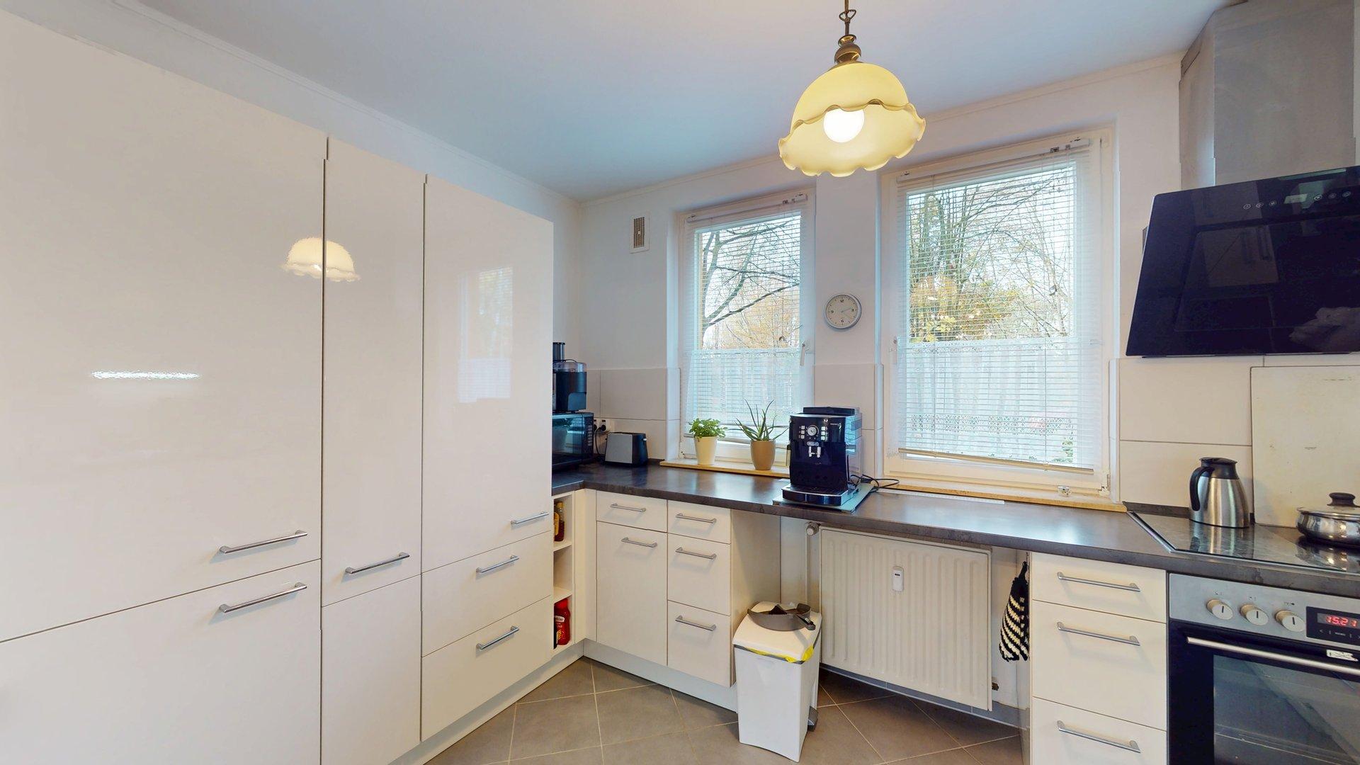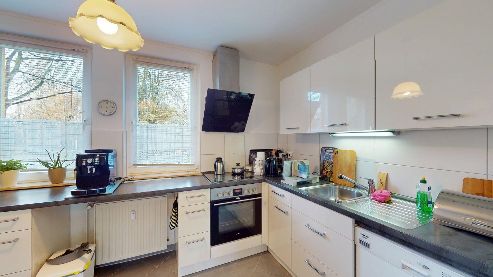Die gepflegte Einbauküche bleibt in der Wohnung. Zusätzlich verfügt die Einheit über ein hell gefliestes Badezimmer sowie ein separates Gäste-WC.