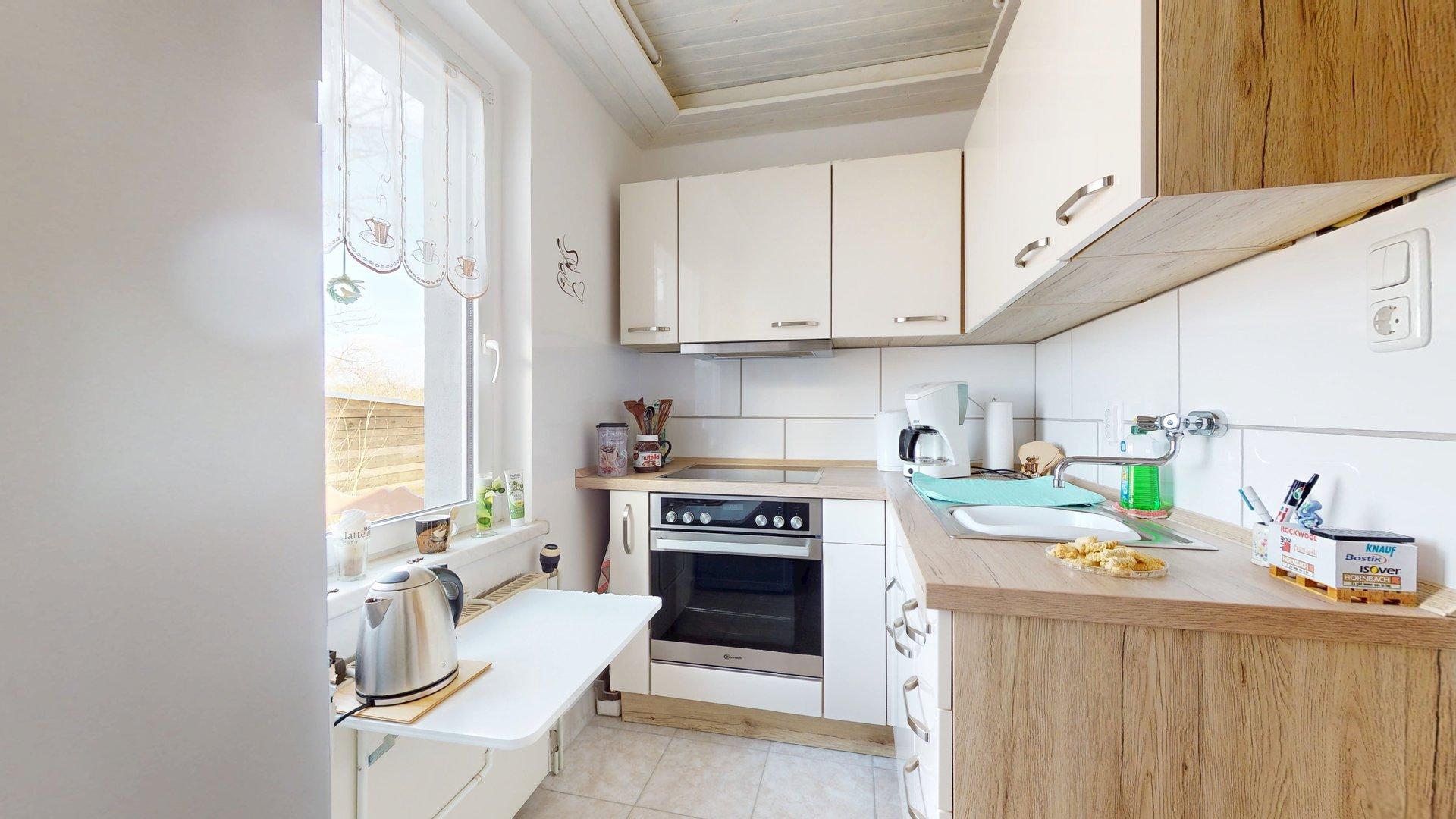 Das Haus selbst ist als kompakter Bungalow konzipiert und bietet im Erdgeschoss eine funktionale Aufteilung mit Wohnzimmer inklusive Kamin, Schlafzimmer, Küche mit Einbauküche, Bad mit Dusche, Flur sowie einem vorgelagerten Wintergarten. Von hier aus ergibt sich ein direkter Bezug zur Terrasse und zum Garten.