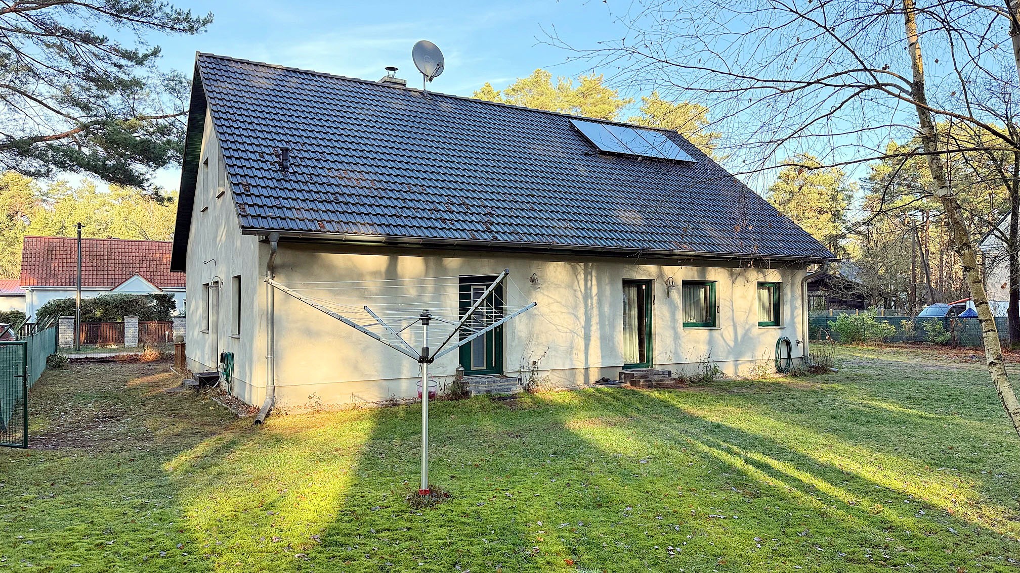 Das großzügige Grundstück ist funktional angelegt und lässt sich leicht pflegen. Die große Rasenfläche grenzt direkt an den Kiefernwald an – ein ruhiges, naturnahes Wohnumfeld ohne dichte Bebauung.