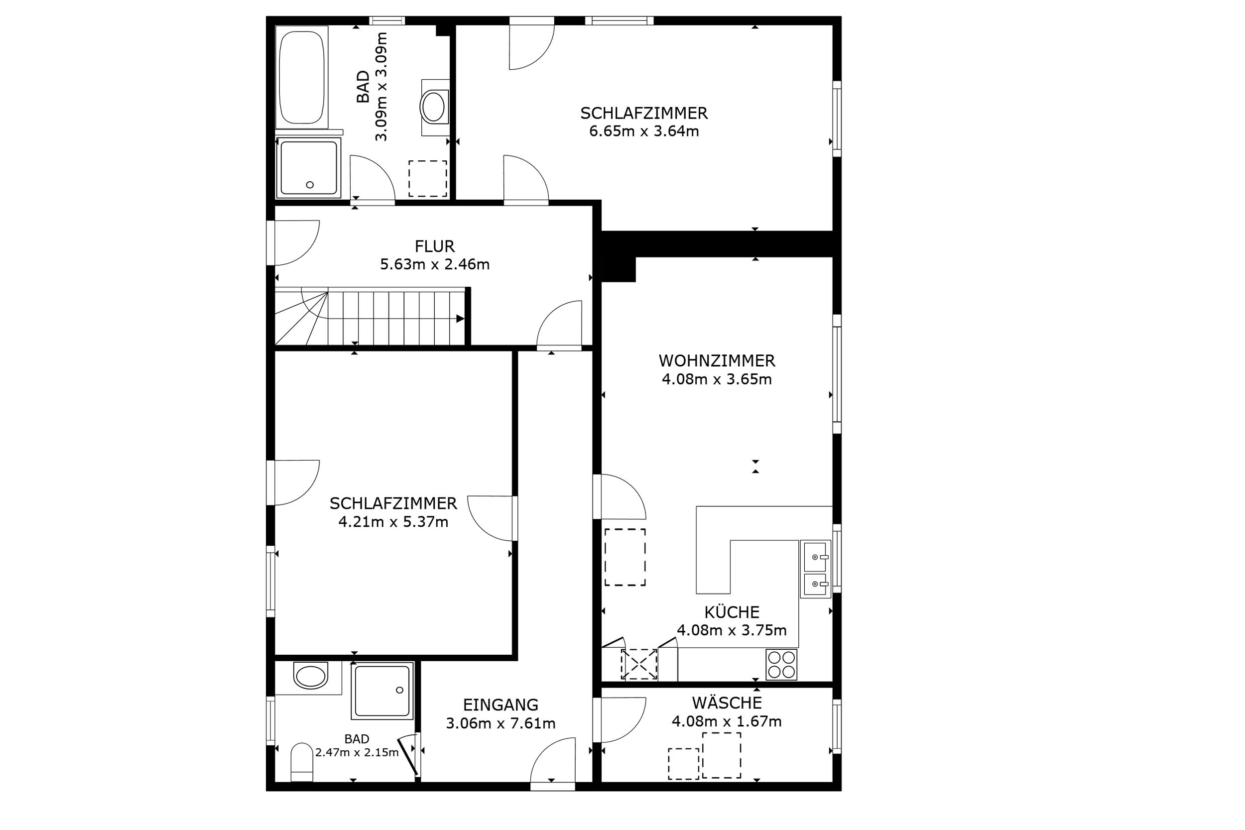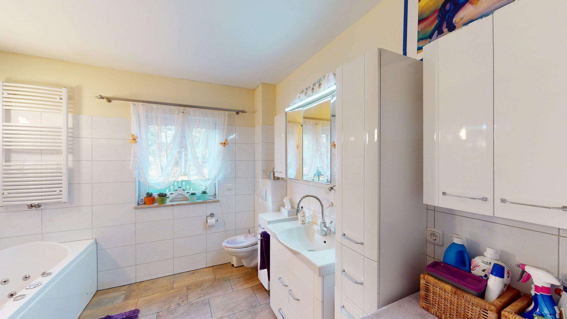 Das Erdgeschoss bildet den zentralen Lebensmittelpunkt: große, gut nutzbare Räume, zwei vollwertige Badezimmer (eines mit Wanne, eines mit Wanne & Dusche) und ein Grundriss, der den Alltag angenehm organisiert.
